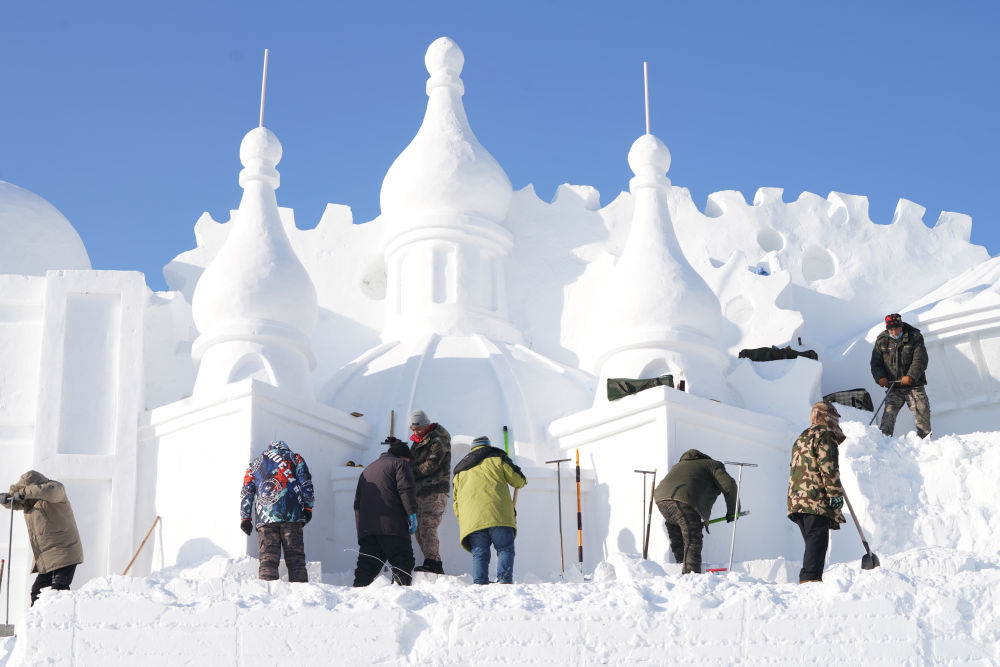 ↑ 12月18日,雕刻师在哈尔滨太阳岛国际雪雕艺术博览会园内进行大型雪塑创作。新华社记者 王松 摄