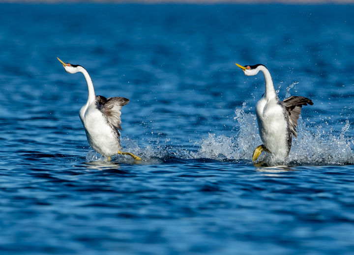 ↑ 3月8日,在美国加州圣何塞南部一个公园,䴙䴘在水面起舞。新华社发(董旭东摄)