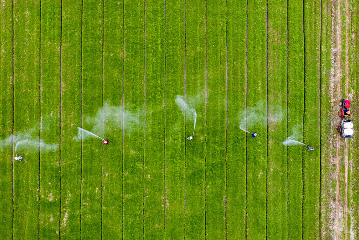 ↑ 2月16日,安徽省庐江县白湖镇农民在进行小麦病虫害防治作业(无人机照片)。新华社发(左学长摄)