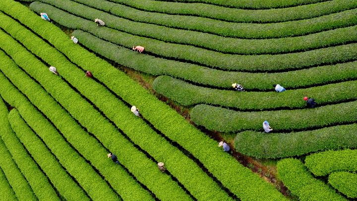 ↑ 4月15日,茶农在武夷山市星村镇的茶山上采摘新茶(无人机照片)。新华社发(陈颖摄)