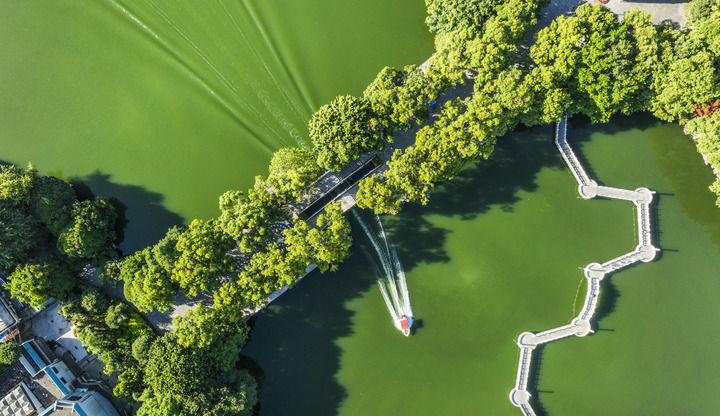 ↑ 10月3日,游客乘船游览广西桂林市桂湖(无人机照片)。新华社发(刘峥摄)