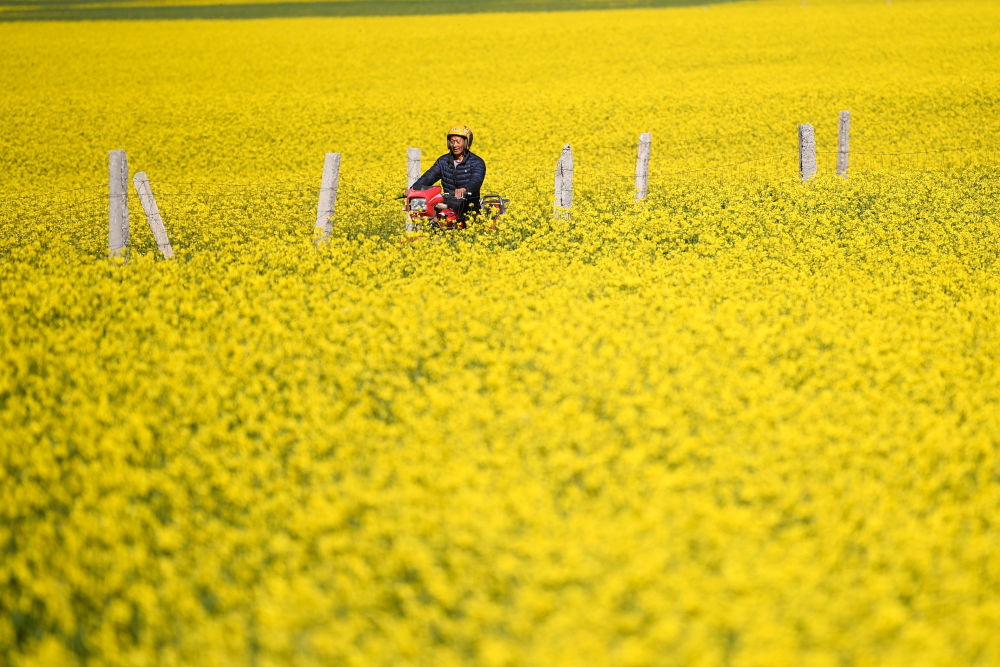 ↑ 7月3日,在青海省海北藏族自治州门源回族自治县,蜂农骑着摩托穿过油菜花田。新华社记者 张龙 摄