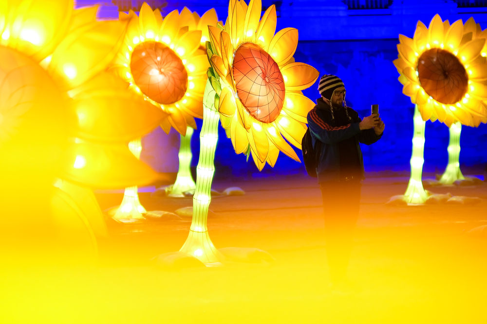 ↑ 2月10日,一名男子在比利时布鲁塞尔欣赏一处灯光艺术作品。新华社记者 张铖 摄