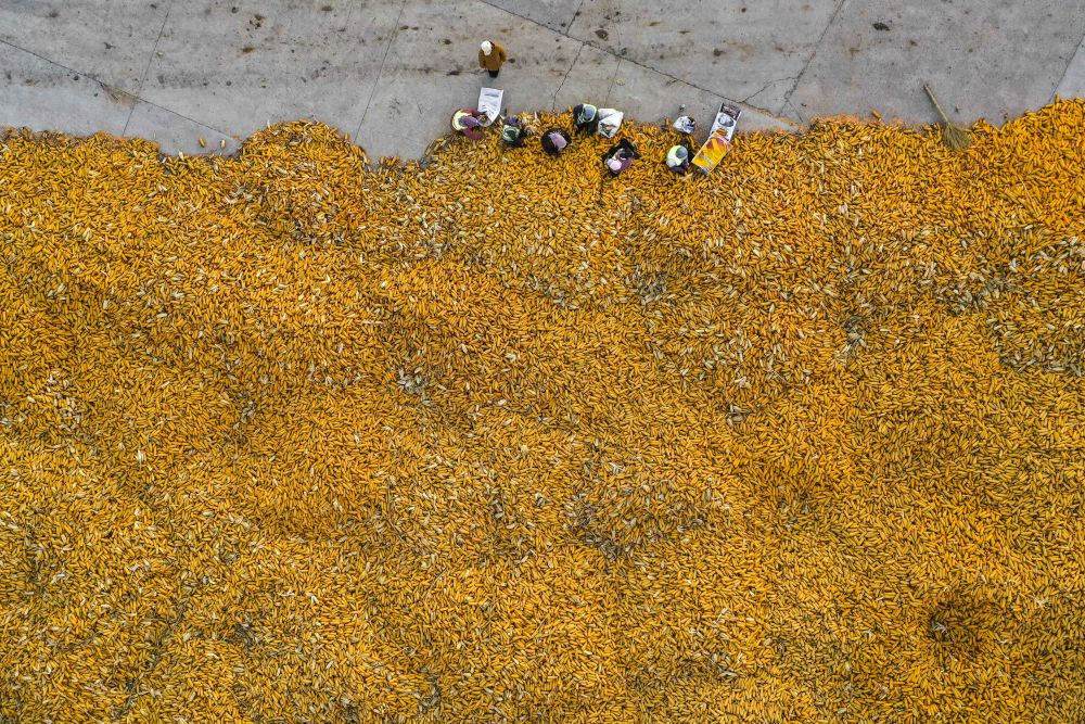 ↑ 11月1日,农民在吉林省公主岭市环岭街道土城子村志和农机服务专业合作社内分拣收获的玉米,准备进行下一步的储存工作(无人机照片)。新华社记者 许畅 摄