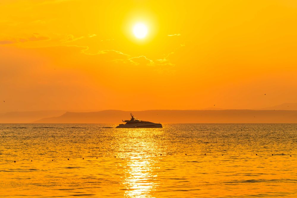 ↑ 这是7月6日在俄罗斯符拉迪沃斯托克拍摄的落日余晖中的游艇。新华社发(郭飞洲摄)