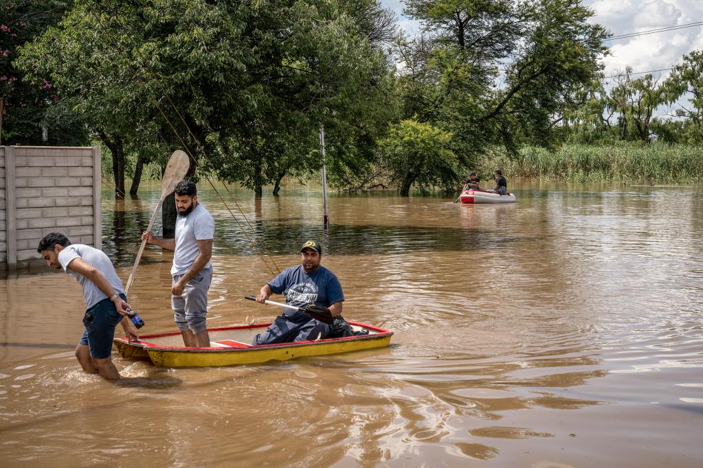 2022年12月9日,在南非约翰内斯堡,受灾居民乘船转移。南非豪滕省部分地区因强降雨引发洪水。(新华社发)