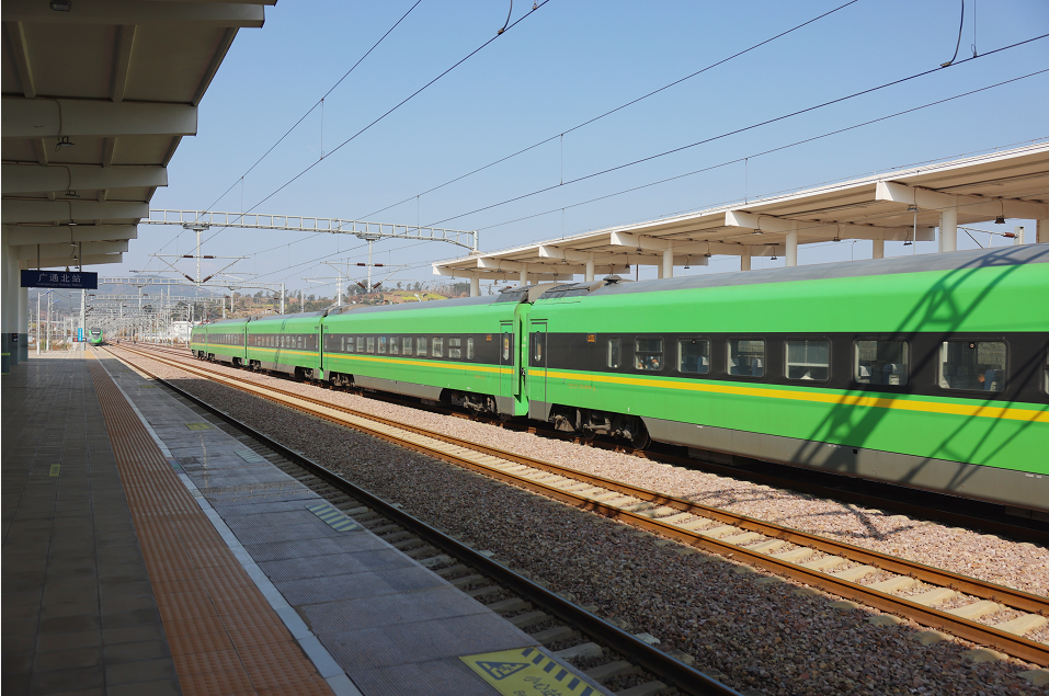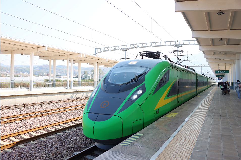“呜呜——”随着一声火车汽笛声由远而近,绿色的复兴号列车D858次缓缓驶入禄丰市广通北站,D858次列车是昆明开往成都的首班列车,于12月26日上午10时53分从昆明站出发,将历时7小时32分,于18时25分到达成都南站。广通北站是D858次列车经新成昆铁路全线贯通运营停靠的首个站点,随后将经过元谋、永仁站,向成都出发。