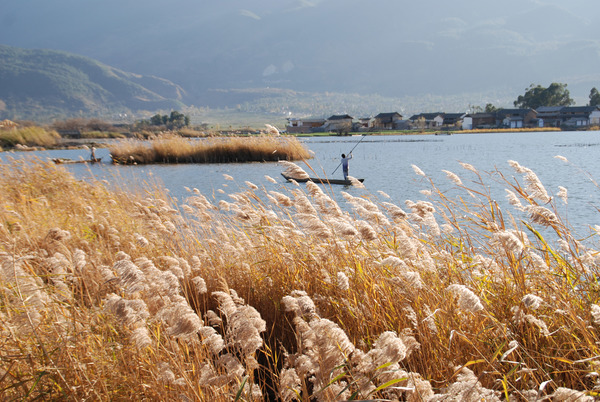 秋景,薄雾中,金黄的稻谷熟了,长满村庄也长满了湿地。白族民居的四周,大山深处,黄灿灿的丰收,抒写了勤劳养育了湖水居住的人民。湖水中悠闲的鱼儿,抚摸倒影的白云,舞蹈自己,为丰收喝彩。一排排整齐排列的村庄,站立,迎接下一个黎明的到来。亲吻着成熟的稻谷,白族汉子终于露出了开心的笑。张开胸怀,把天下的美景拥抱。
