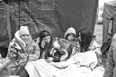 2月27日,在罗马尼亚北部与乌克兰接壤的锡雷特边境关口,乌克兰女子在帐篷外打电话。新华社发