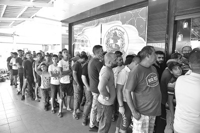 7月10日,人们在黎巴嫩的黎波里排队购买面包。新华社发