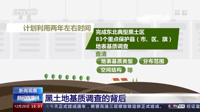 自然资源部表示,根据《黑土地地表基质调查总体方案》,计划利用两年左右时间,完成东北典型黑土区83个重点保护县(市、区、旗)地表基质调查,查清地表基质类型、分布范围、空间结构等。