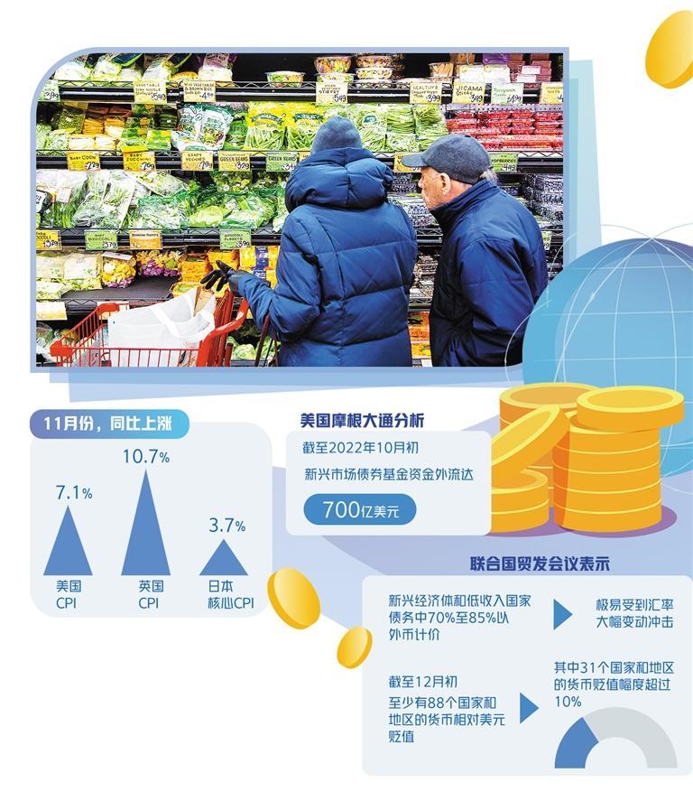 例如,美国消费价格指数(CPI)同比涨幅在6月份曾高达9.1%,创1981年11月份以来新高,而较近的11月份CPI同比上涨7.1%,虽是2021年12月份以来最小同比涨幅,但仍在高位运行。欧元区10月份调和CPI终值同比上涨10.6%,创历史新高,11月份为10.1%,通胀有所放缓,但高位不变。英国10月份CPI同比上涨11.1%,创下40年来新高,11月份为10.7%,涨幅略有缩小。而多年来被“紧缩”困扰的日本也开始面临物价走高问题,11月份除生鲜食品以外的核心CPI连续15个月同比上升,增长3.7%,涨幅为1981年12月份以来最高。