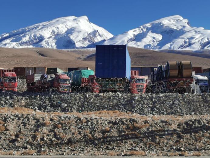 12月17日,帕米尔高原上,皑皑雪山下,不少货车在新疆卡拉苏口岸货物堆场等候出境。(新华社记者刘红霞 摄)