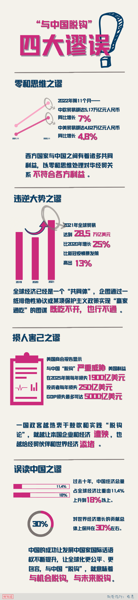 鼓动“与中国脱钩”时,却极力矮化中国经济的全球地位;炒作所谓“中国经济拖累世界”时,又大谈中国经济的国际影响。这种无法自洽的“脱钩论”与此前所谓中国经济“崩溃论”“威胁论”等栽赃话术一样,违背经济规律,脱离客观实际,暴露西方一些政客零和思维之谬、违逆大势之谬、损人害己之谬和误读中国之谬。