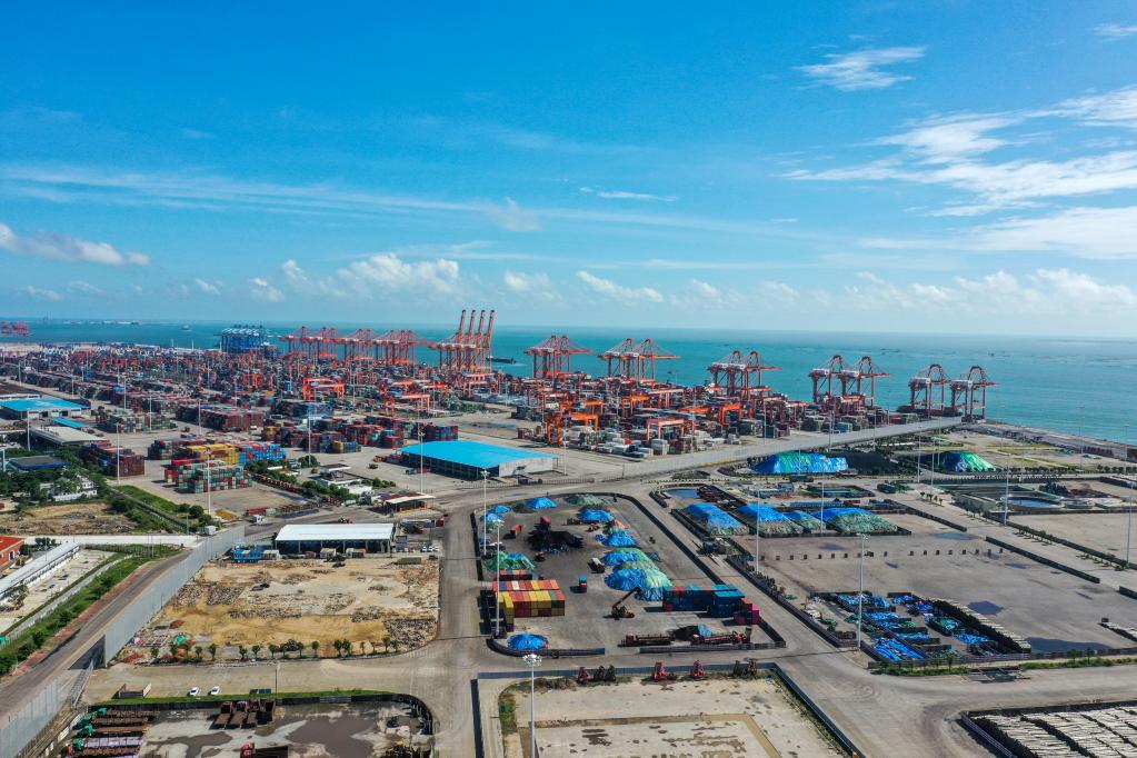 这是2022年8月27日拍摄的位于平陆运河出海口附近的北部湾港钦州港区大榄坪作业区(无人机照片)。(新华社记者曹祎铭摄)