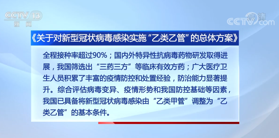 《方案》指出, 当前,随着病毒变异、疫情变化、疫苗接种普及和防控经验积累,我国新型冠状病毒感染疫情防控面临新形势新任务,防控工作进入新阶段。从病毒变异情况看,国内外专家普遍认为病毒变异大方向是更低致病性、更趋向于上呼吸道感染和更短潜伏期,新冠病毒将在自然界长期存在,其致病力较早期明显下降,所致疾病将逐步演化为一种常见的呼吸道传染病。从疫情形势看,奥密克戎变异株已成为全球流行优势毒株,虽然感染人数多,但无症状感染者和轻型病例占比超过90%,重症率和病亡率极低。从我国防控基础看,我国目前累计接种新冠病毒疫苗超过34亿剂次,3岁以上人群全程接种率超过90%;国内外特异性抗病毒药物研发取得进展,我国筛选出“三药三方”等临床有效方药;广大医疗卫生人员积累了丰富的疫情防控和处置经验,防治能力显著提升。综合评估病毒变异、疫情形势和我国防控基础等因素,我国已具备将新型冠状病毒感染由“乙类甲管”调整为“乙类乙管”的基本条件。