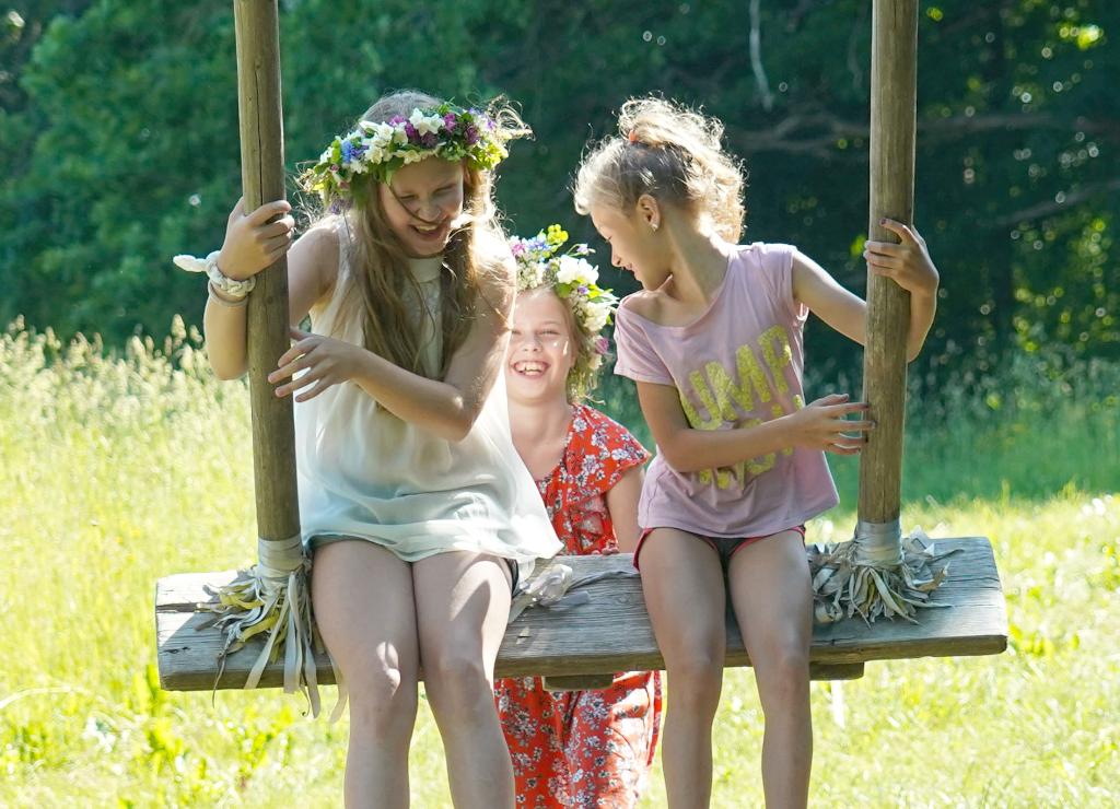 2020年6月21日,头戴花冠的女孩们在拉脱维亚乡村增特内的草坪上玩耍。新华社发(亚尼斯摄)