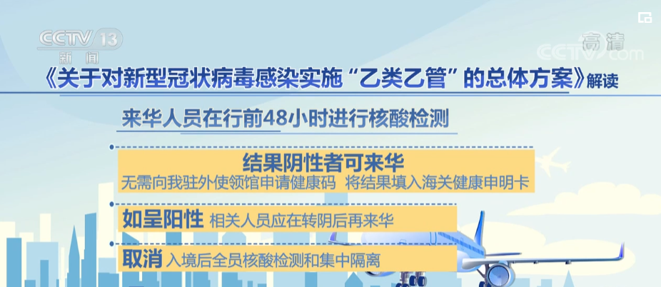 按照《总体方案》要求,来华人员在行前48小时进行核酸检测,结果阴性者可来华,无需向我驻外使领馆申请健康码,将结果填入海关健康申明卡。如呈阳性,相关人员应在转阴后再来华;取消入境后全员核酸检测和集中隔离。健康申报正常且海关口岸常规检疫无异常者,可放行进入社会面;取消“五个一”及客座率限制等国际客运航班数量管控措施;各航空公司继续做好机上防疫,乘客乘机时须佩戴口罩;进一步优化复工复产、商务、留学、探亲、团聚等外籍人士来华安排,提供相应签证便利。逐步恢复水路、陆路口岸客运出入境。根据国际疫情形势和各方面服务保障能力,有序恢复中国公民出境旅游。