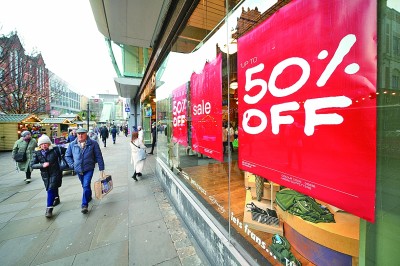 12月13日,人们走过英国曼彻斯特街上的促销广告。英国的通胀率在10月达到11.1%,创下41年来的新高。图片为新华社发