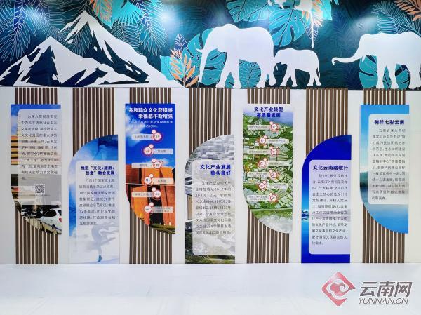云南展区的整体设计取意于云南“一颗印”式传统民居建筑,顶部悬挂“扎染”主题装饰,呈现文艺典雅的空间情境。展区以图文展示、实物展出为主,结合多媒体演示、电视专题片等数字化陈展方式,充分展现云南围绕“讲好五个故事”挖掘系列作品体系和产品体系,围绕传统民族民间手工艺,推动“传统技艺+现代创意”的文化产业发展成效。