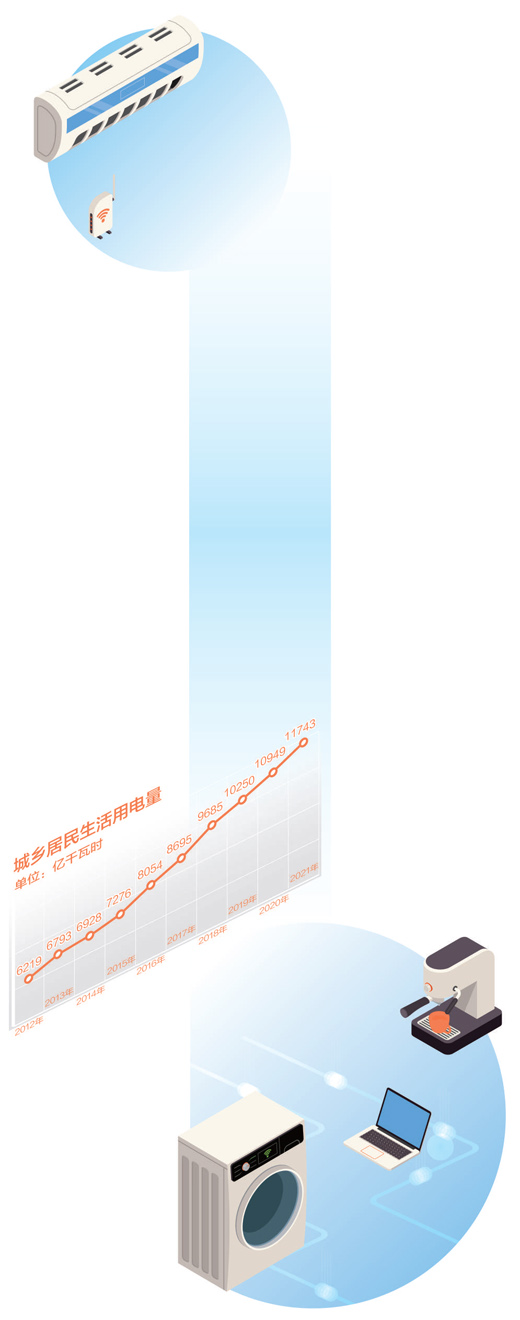 电力,是经济发展的晴雨表,也关乎民生温度。如今,我国电力装机容量和发电量稳居世界第一。2021年,城乡居民生活用电量11743亿千瓦时,与2012年的6219亿千瓦时相比,增长了89%。2022年前11月,城乡居民生活用电量12101亿千瓦时,同比增长12%。在奔涌的电流前端,旧家电更新换代,新电器“飞”入千家万户,人们的幸福感随之增长。