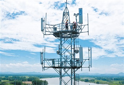 安徽省铜陵市义安区胥坝乡一座5G基站铁塔上,工作人员在调测天线。 过仕宁摄(人民视觉)