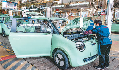 江苏省南京市长安汽车有限公司生产车间一派繁忙景象,工人们加班加点组装新款新能源汽车,以满足市场订单需求。 朱红生摄(人民视觉)
