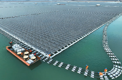 近日在国家能源集团山东电力有限公司聊城发电运营分公司循环水水库漂浮式光伏发电项目建设现场,工人进行组件铺设的最后安装。 张振祥摄(人民视觉)