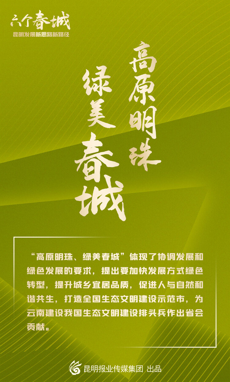 “六个春城”,充分体现了贯彻“创新、协调、绿色、开放、共享”新发展理念的要求,同时与省委提出的昆明要在“六个方面”当好排头兵的要求相对应。
