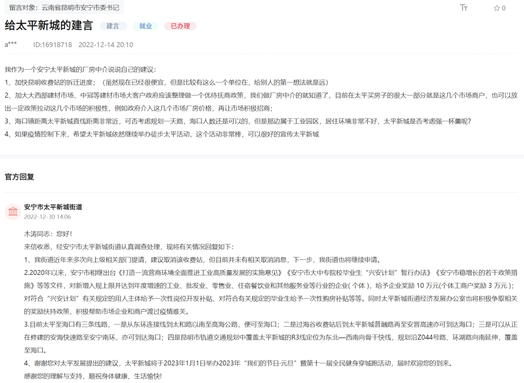 近日,有网友给太平新城的建言,提到“加快昆明收费站的拆迁进度”“海口镇距离太平新城直线距离非常近,可否考虑规划一条路”等。