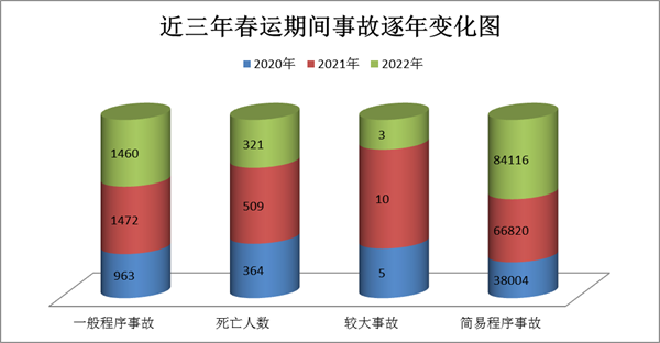 近三年春运期间,全省共发生一般程序道路交通事故3895起,平均每年春运期间发生一般程序处理交通事故1298起。从简易程序处理的事故情况看,2020年、2021年、2022年分别发生38004起、66820起、84116起,呈现逐年上升趋势。