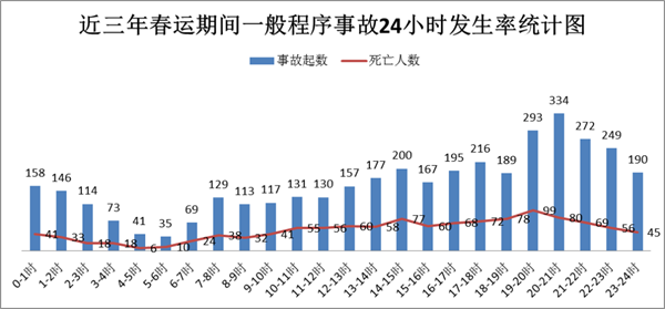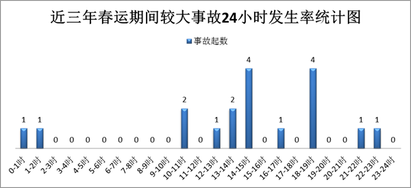 晚间事故高发,午后及傍晚较大事故高发。近三年春运期间,一般程序事故晚间19时-23时事故高发,事故起数和死亡人数分别占总数29.47%和25.46%。较大事故13时-15时、18时-19时事故高发,分别发生事故6起和4起,分别占较大事故总数的33.33%和22.22%。