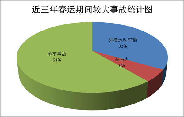 单方车辆事故特别是农村地区翻坠较大事故突出。近三年春运期间,发生单方车辆较大事故11起,占近三年春运较大事故总数的61.11%,其中翻坠事故8起。农村县乡村道发生较大交通事故7起(其中6起为翻坠车事故),占全省较大交通事故总量的38.89%,农村交通事故防控重点仍然是较大事故。