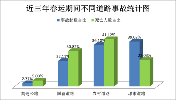 农村道路致人死亡数占比高。近三年春运期间,农村道路发生的事故致人死亡数最多,占死亡人数总量的41.12%;其次普通国省道事故致人死亡数占总量的30.82%。