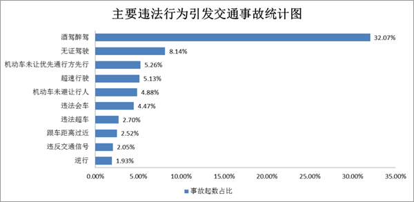 酒驾醉驾在春运期间肇事突出。近三年春运期间,酒驾醉驾交通违法行为引发事故最多,占总量的32.07%,分列二至五位的分别是无证驾驶、机动车未让优先通行方通行、超速行驶、机动车未避让行人,分别占春运事故总量的8.14%、5.26%、5.13%、4.88%。