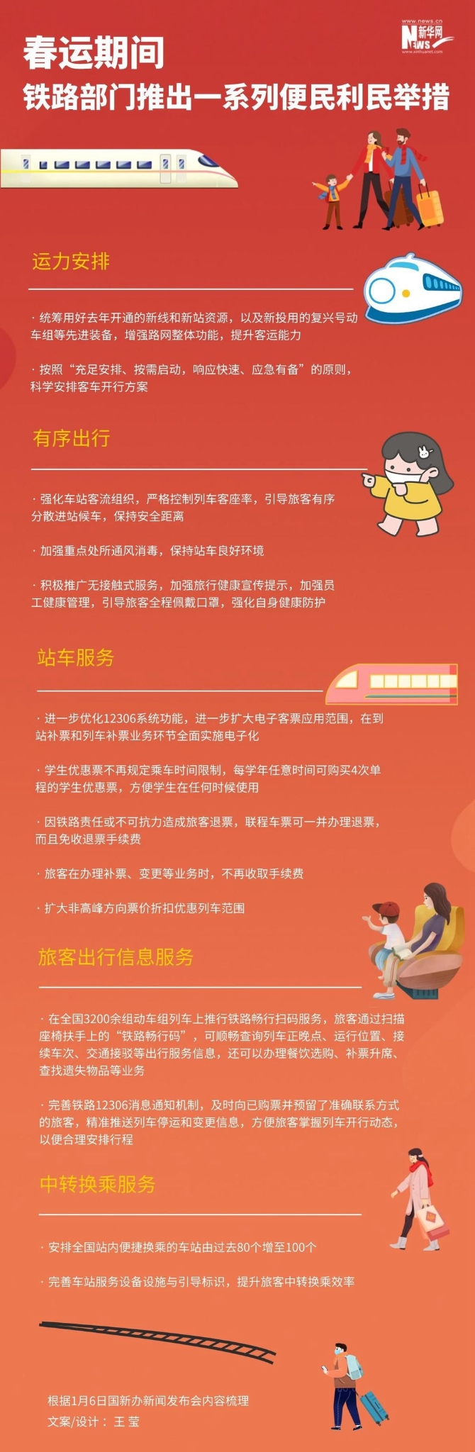 每年春运,铁路都发挥着重要作用,今年春运铁路部门将采取哪些新的举措?对此,国铁集团客运部主任黄欣介绍,铁路部门优化春运的客车开行方案,精准落实好疫情防控措施,在乘车、候车、购票等环节,推出一系列便民利民举措,全力打造平安、有序、温馨春运,努力让旅客体验更加美好。具体如下: