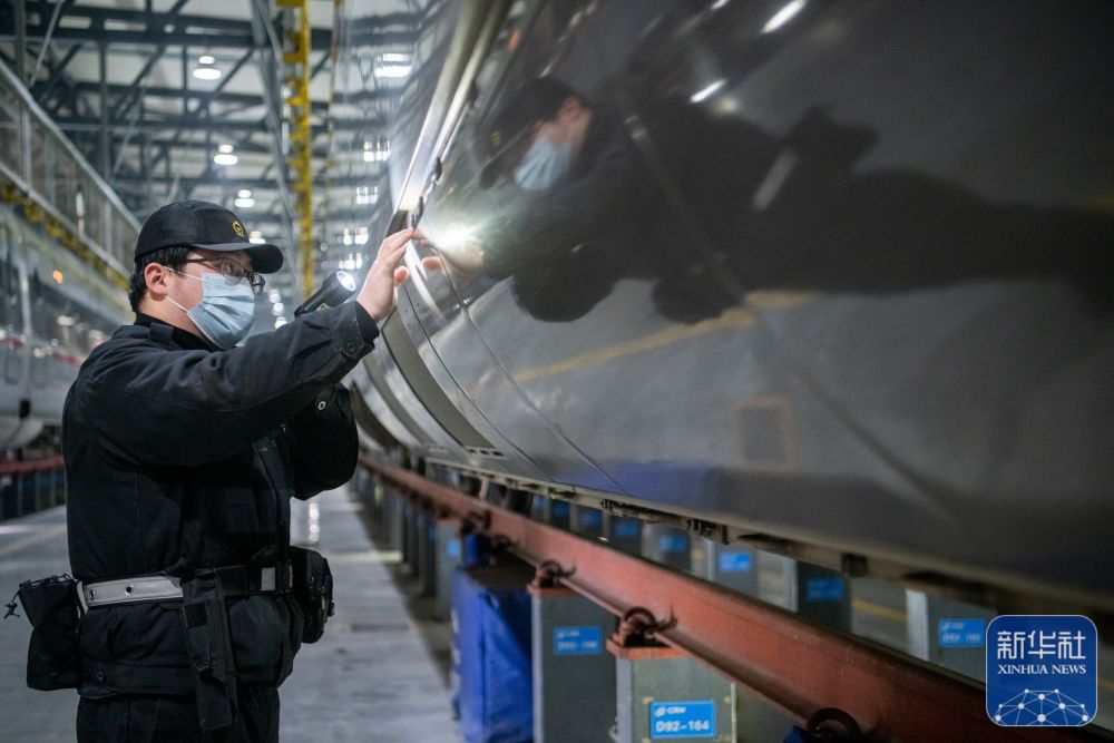 1月6日,地勤机械师在检查动车组列车车体外观状态。新华社记者 伍志尊 摄