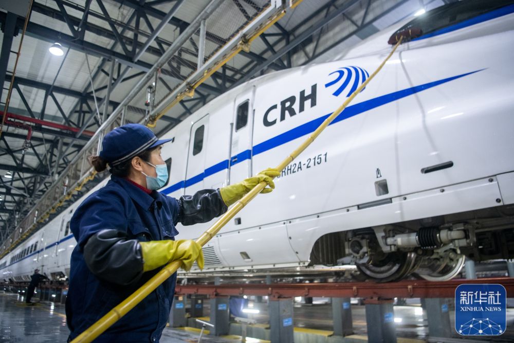 1月6日,保洁人员在清洗动车组。新华社记者 伍志尊 摄