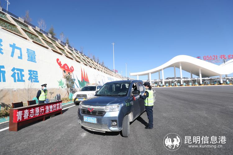 记者在昆楚高速花红园收费广场也看到,收费站设置了挂有“青春志愿行 温暖回家路”条幅的服务点,针对来往有需要的车主,志愿者会送上矿泉水、热水、口罩等暖心物资,为出行人员“保驾护航”。