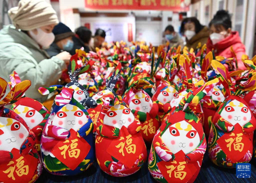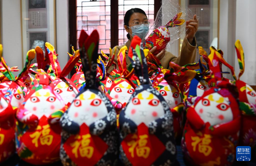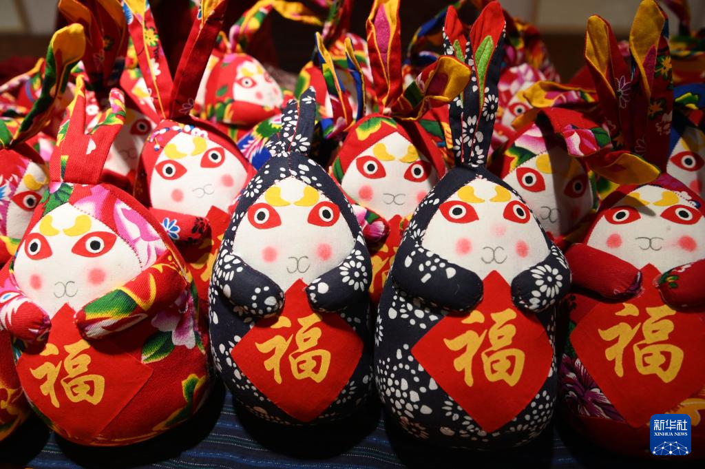 这是1月8日在山东省聊城市东昌府区棉文化手工博物馆拍摄的生肖玩偶兔。新华社发(张振祥/摄)