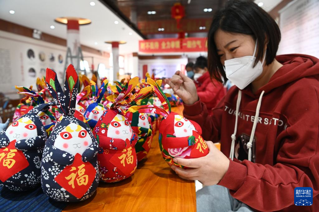 1月8日,在山东省聊城市东昌府区棉文化手工博物馆,工人包装生肖玩偶兔。新华社发(张振祥/摄)