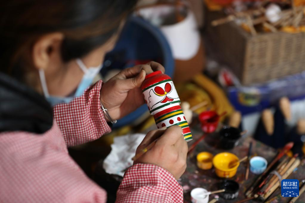 1月8日,山东省临沂市郯城县港上镇樊埝后村村民在给木旋玩具上色。新华社发(张春雷/摄)