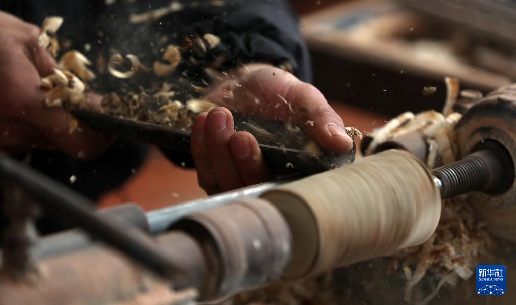1月8日,山东省临沂市郯城县港上镇樊埝后村村民在旋制木旋玩具毛坯。新华社发(张春雷/摄)
