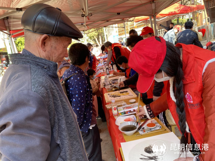 在金源乡中心完小门前,由昆明书法家协会、昆明美术家协会、寻甸书法家协会、寻甸美术家协会组成的文艺志愿者团队,在现场泼墨挥毫,将新春的祝福融入到作品中,一张张“福”字、一副副对联、一篇篇画作应运而生。