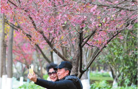新年伊始,安宁温泉滨河公园冬樱花进入盛花期,粉红的冬樱花竞相绽放,让人提前感受到浓浓的春意。