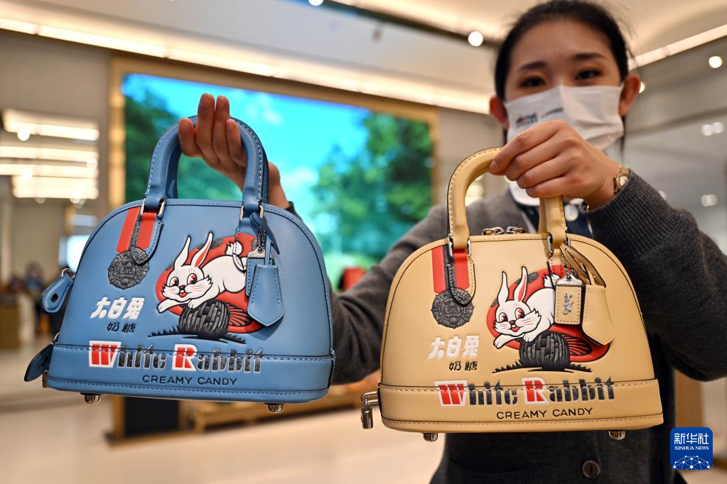 在海口国际免税城拍摄的联名款兔年主题手提包(1月8日摄)。新华社记者郭程/摄