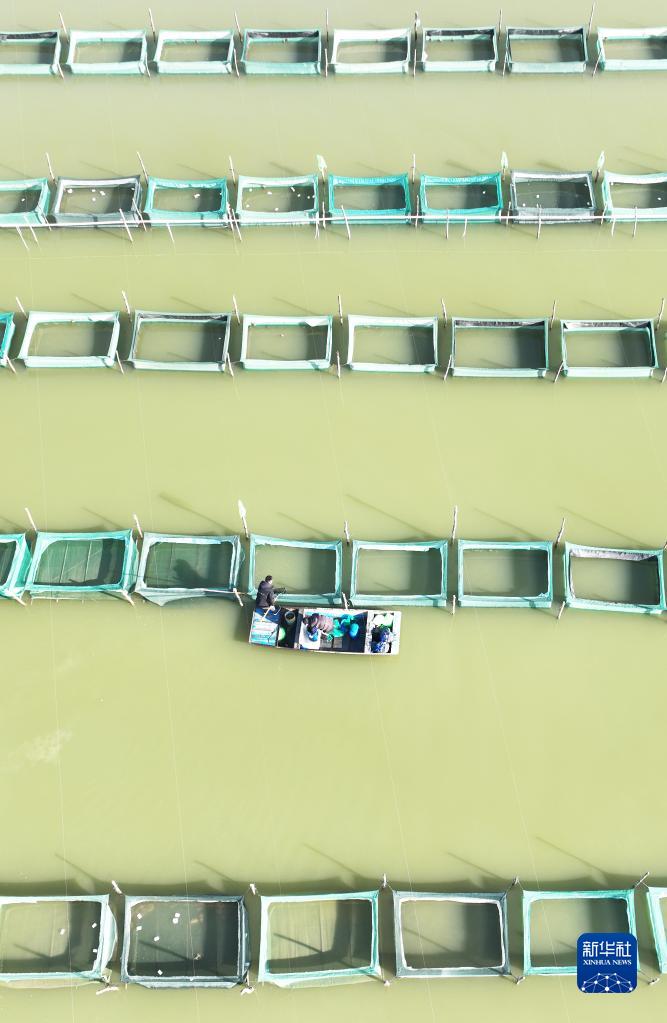1月8日,在泗洪县临淮镇螃蟹养殖基地,养殖户在捕捞螃蟹(无人机照片)。新华社发(许昌亮摄)