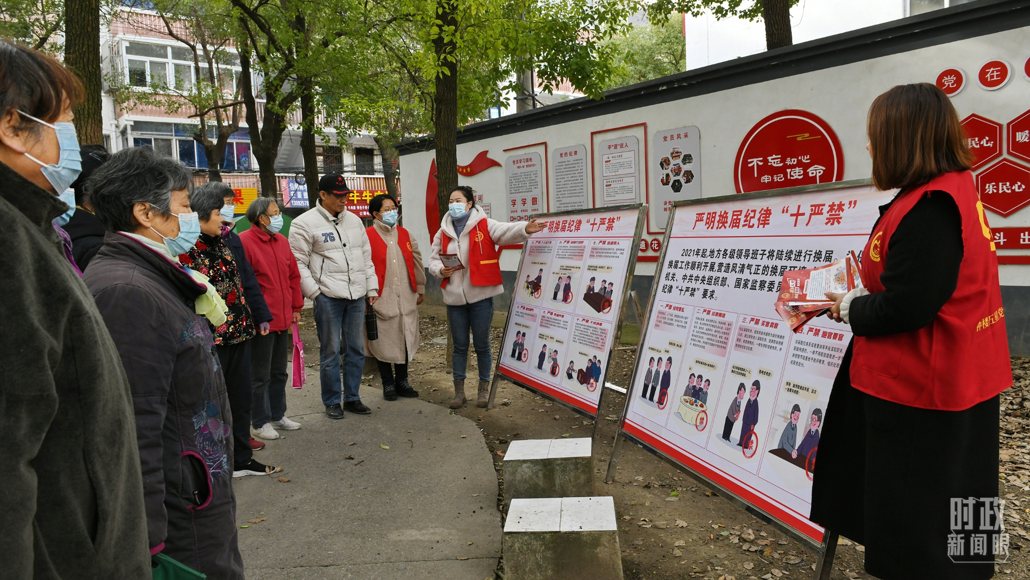 △2021年11月22日,江苏省常州市钟楼区纪检工作人员在社区健身广场向辖区选民宣传钟楼区第十七届人大换届纪律“十严禁”。(图/视觉中国)