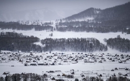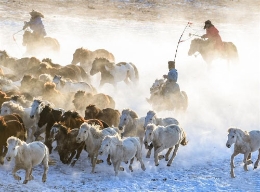 寒冬时节,内蒙古锡林郭勒盟西乌珠穆沁旗的草原银装素裹,树木点缀其间,动物悠闲觅食,一派美丽的冬日景象。