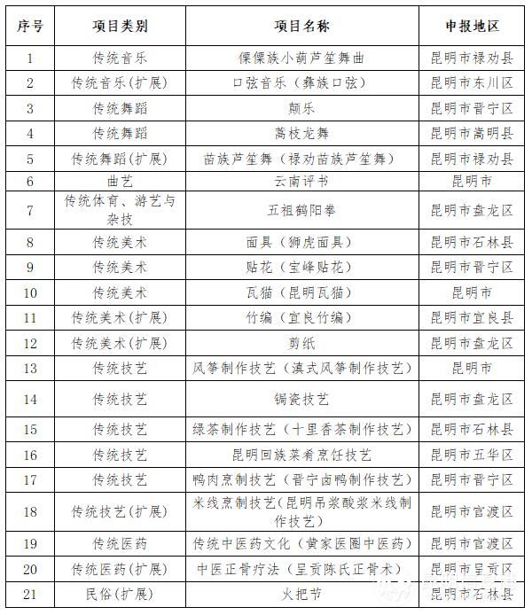 昆明信息港讯 近日,云南省政府公布第五批云南省非物质文化遗产代表性项目名录,昆明市共有21个项目入选,涵盖了传统音乐、曲艺、民俗等八大项目类别。